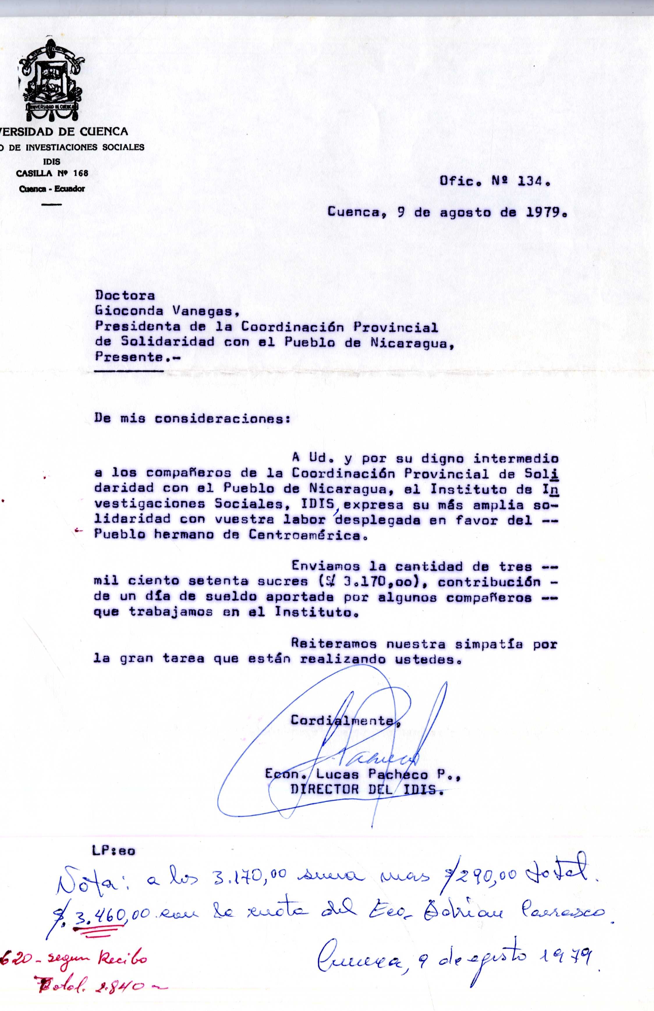Comunicación emitida por el Economista Luchas Pacheco P. Director del Instituto de Investigaciones Sociales de la Universidad de Cuenca, indicando la donación de 3.170,00 sucres en solidaridad con Nicaragua.